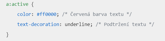 Když uživatel klikne na prvek (například tlačítko), stane se aktivním. Pseudotřída :active umožňuje definovat specifický vzhled tohoto prvku v okamžiku, kdy je aktivní.