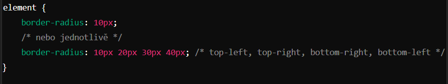 vrátit se zpět na hlavní stánkuVlastnost border-radius se používá k zaoblení rohů rámečku. Lze nastavit pro všechny rohy najednou nebo pro každý roh zvlášť.